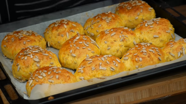 Wyrośnięte, wykładamy na lekko oprószony i dzielimy na około 10 części. Z każdej formujemy w kulkę i układamy na blaszce wyłożonej papierem do pieczenia.