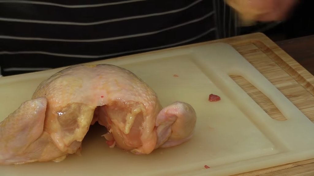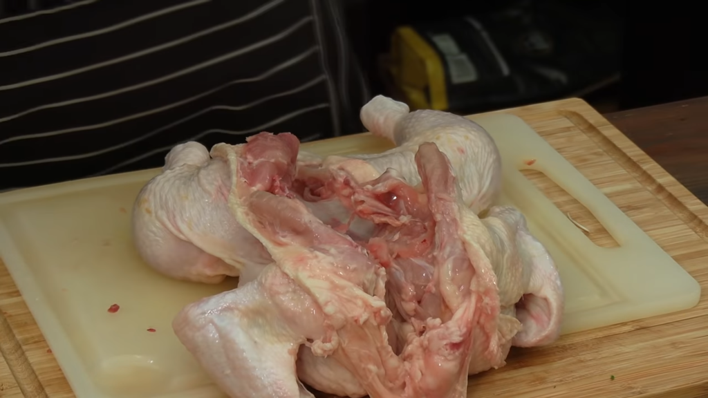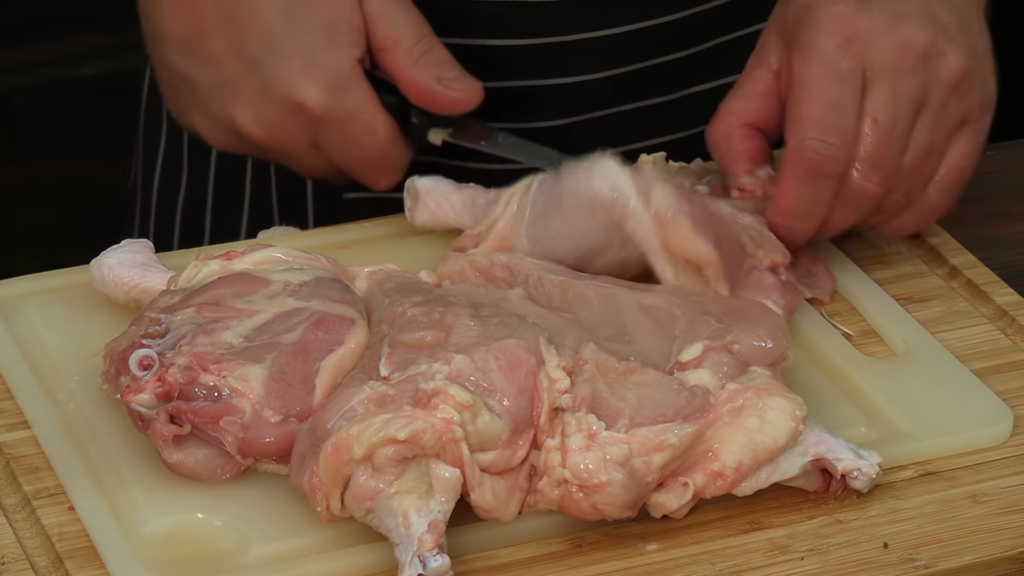 Kurczaka należy odwrócić grzbietem do góry i naciąć skórę wzdłuż kręgosłupa. Nożem trzymając się jak najbliżej kości wycinamy mięso na dwie strony i wyjmujemy korpus. Następnie nacinamy wzdłuż kości na udkach i wyjmujemy kości. Tą samą czynność powtarzamy na skrzydełkach.