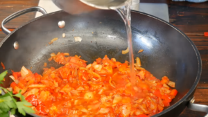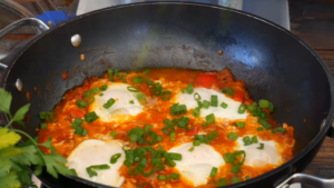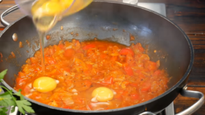 Na patelni przysmażamy cebulkę, dodajemy kmin rzymski, kolendrę, czosnek, paprykę, pomidory oraz koncentrat pomidorowy. Dzięki podsmażeniu koncentratu pomidorowego jesteśmy w stanie wydobyć z niego cały aromat i smak. Całość należy zalać wodą i dusić jakieś 15 minut, po to aby smaki się dobrze połączyły i odparowała jak największa ilość wody. Gdy konsystencja jest gęsta można dodać jajka. Szakszuka jest gotowa gdy białko się zetnie a żółtko w środku pozostanie płynne. Cały proces przygotowania potrawy znajdziecie w filmie poniżej.